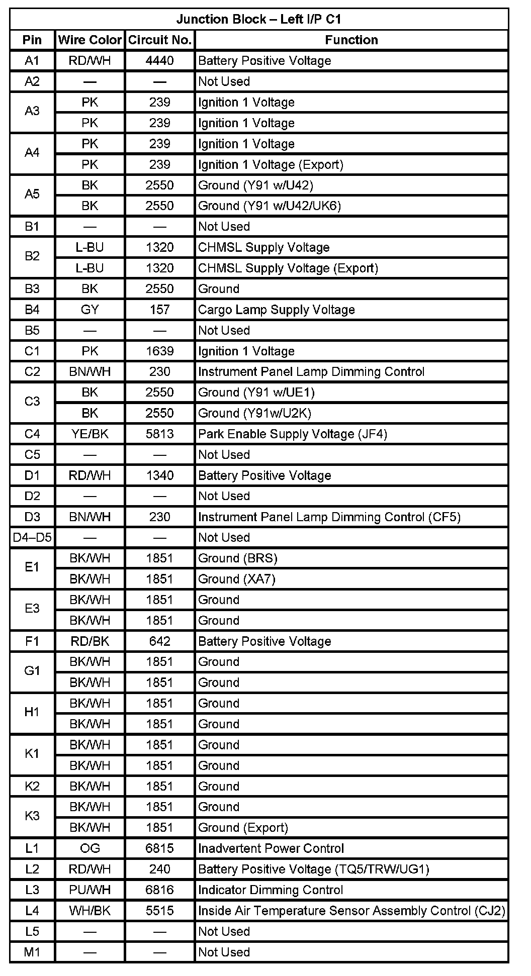 Junction Block - Left I/P C1 (Pin A1 To M1):