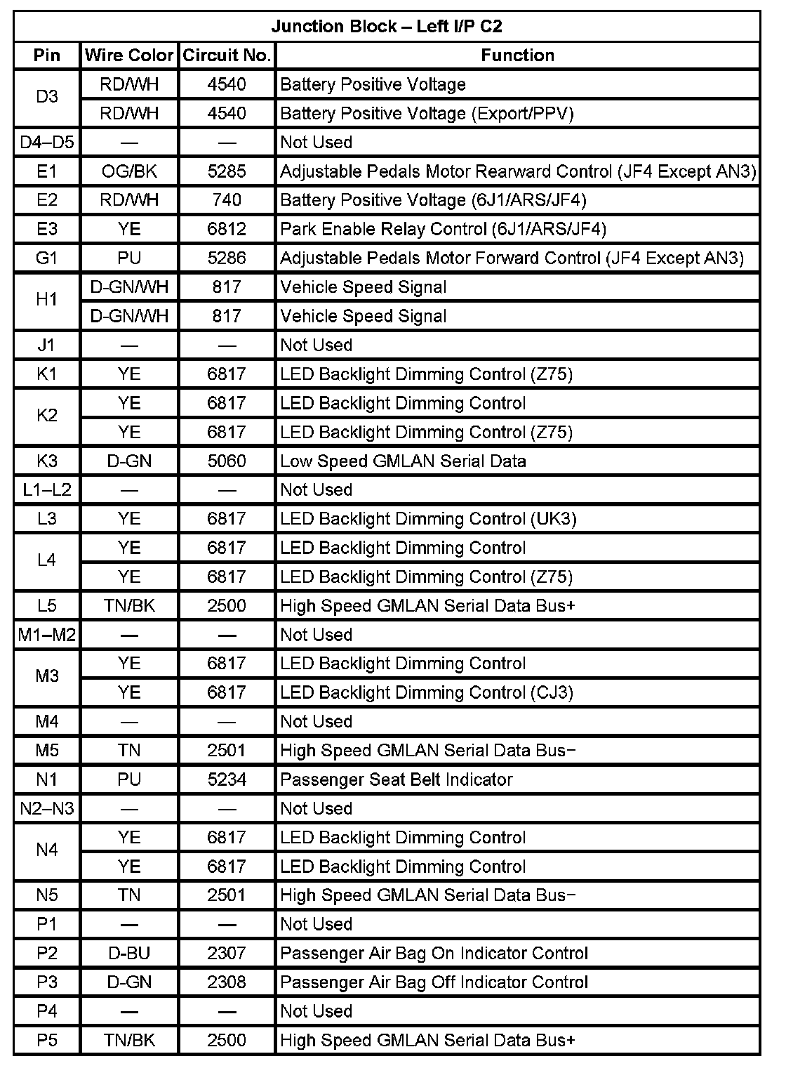 Junction Block - Left I/P C2 (Pin D3 TO P5):