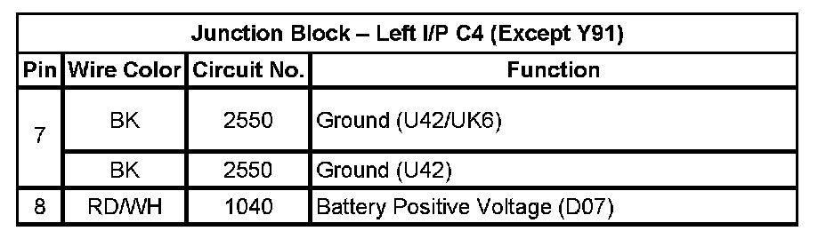 Junction Block - Left I/P C4 (Except RPO Code Y91) (Pin 7 To 8):