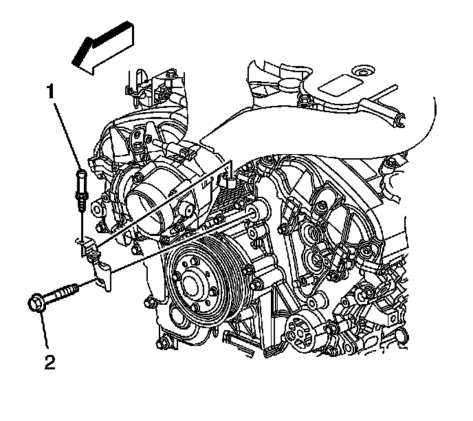 11. Remove the upper intake manifold brace stud (1), and bolt (2), reposition the brace with the wiring harness.