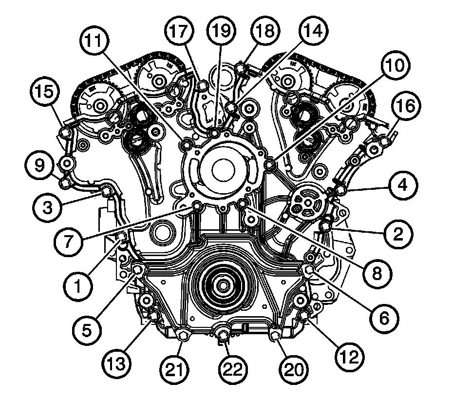Tighten the engine front cover bolts in the sequence shown (1-22).