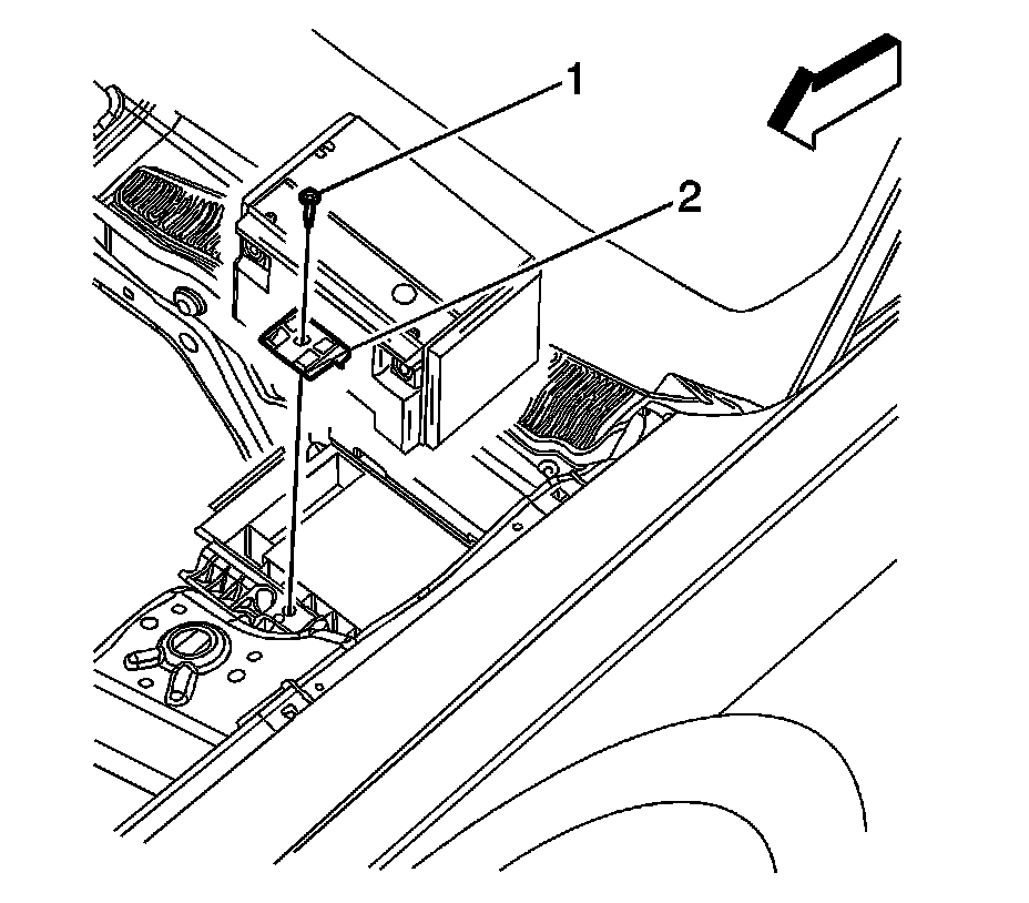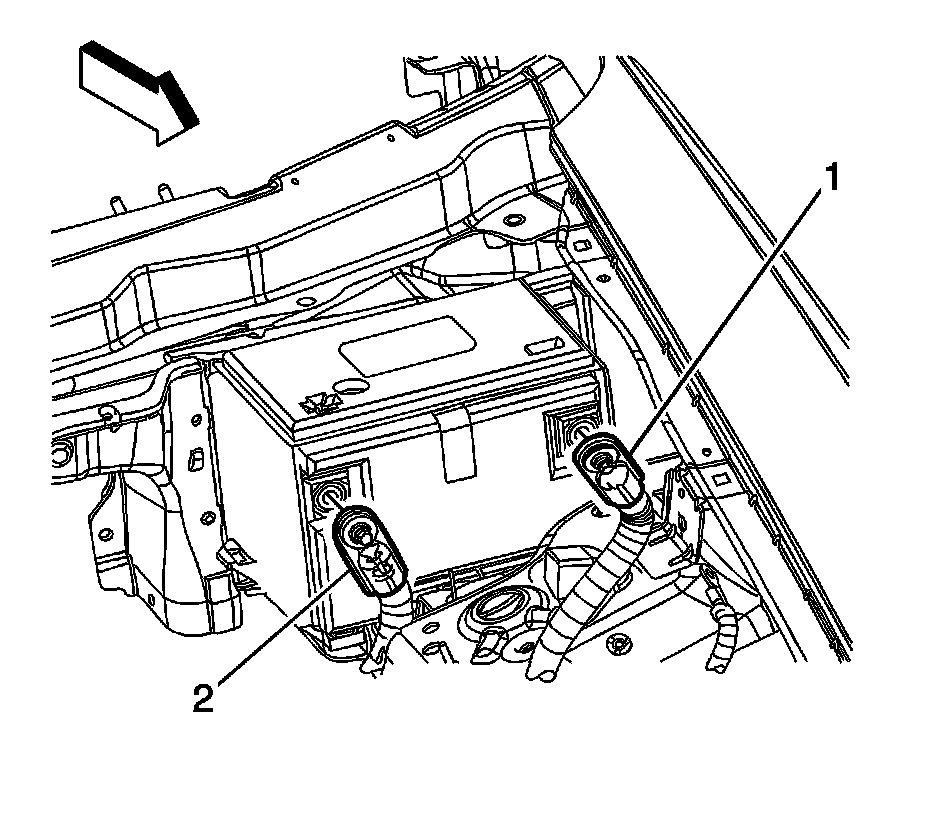 6. Remove the battery hold down retainer bolt (1) and retainer (2).