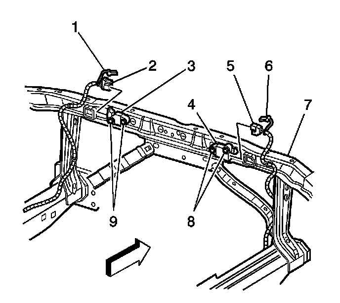 4. Loosen the front end sensor mounting fastener (8, 9), which is located in the upper tie bar.