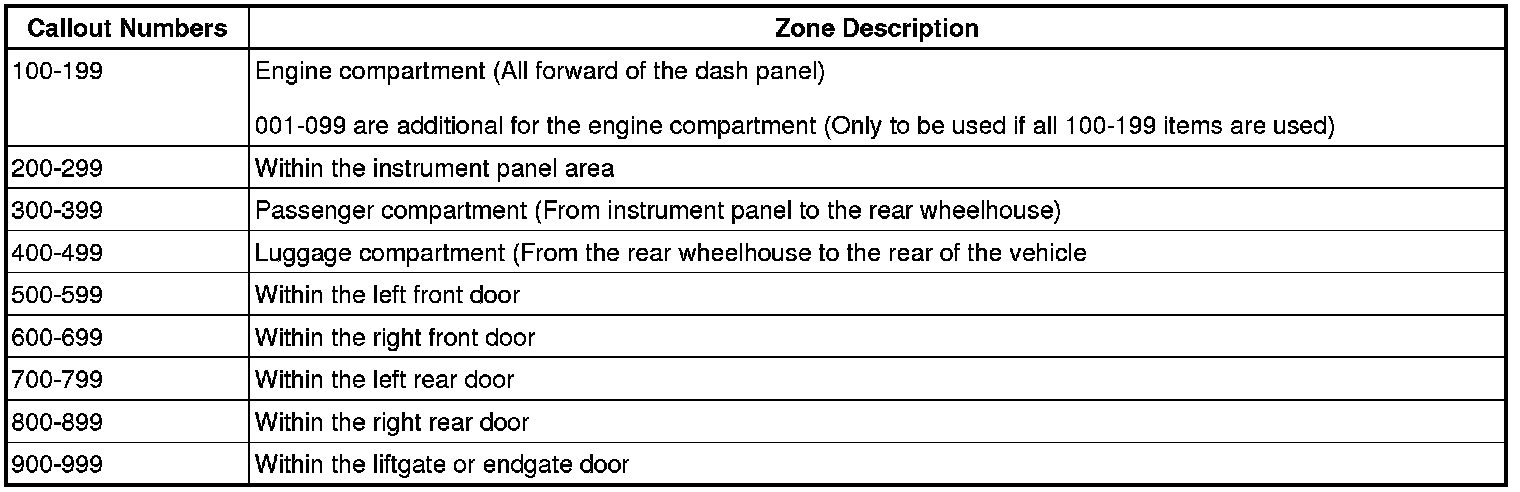 All grounds, in-line connectors, pass-through grommets, and splices have identifying numbers that correspond to where they are located in the vehicle. The following table explains the numbering system.