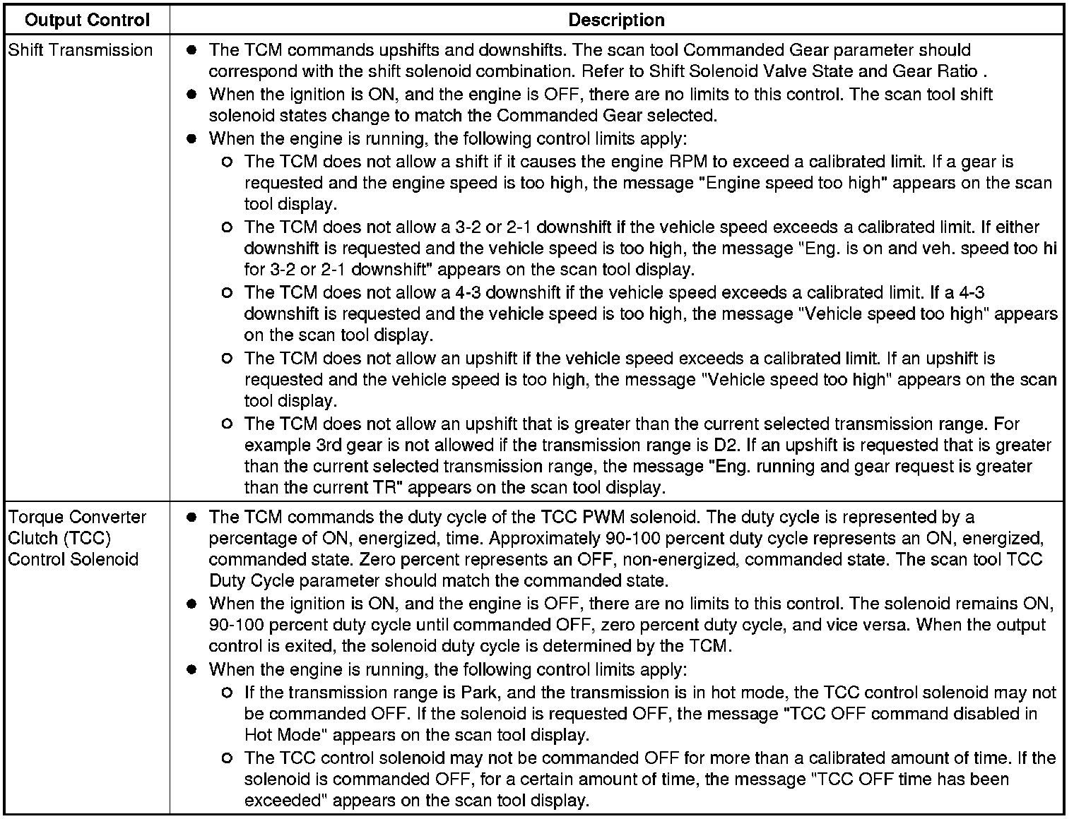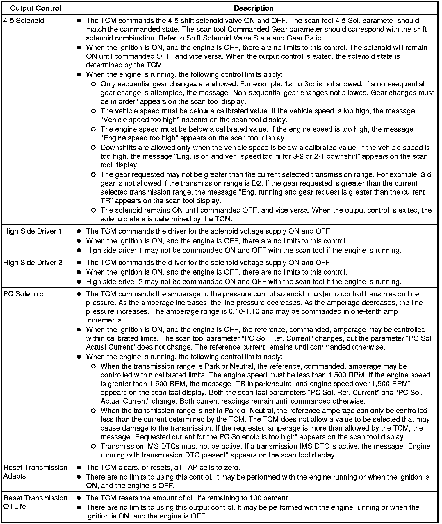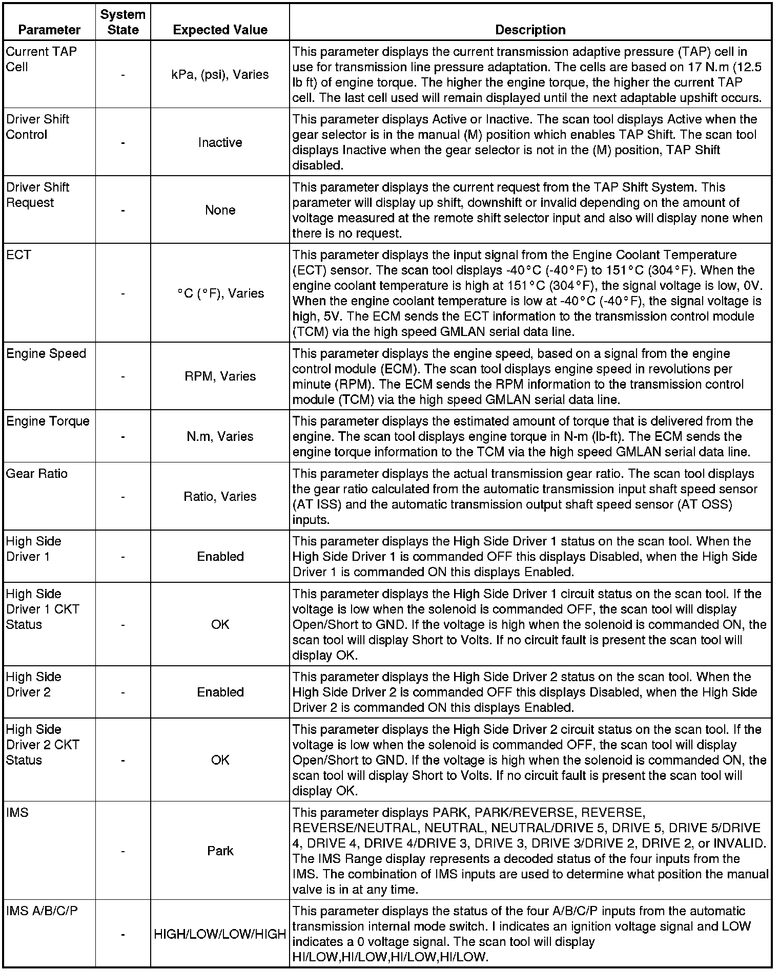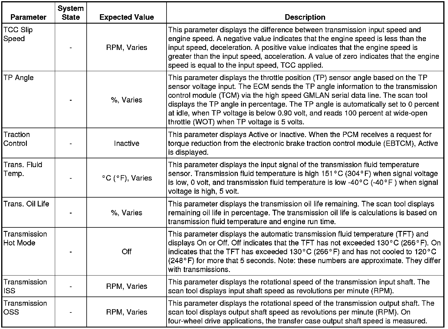 The Transmission Control Module Scan Tool Data List contains all transmission related parameters that are available on the scan tool. The list is arranged in alphabetical order. A given parameter may appear in any one of the data lists, and in some cases may appear more than once, or in more than one data list in order to group certain related parameters together.