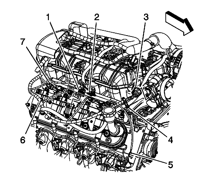 35. Connect the engine harness electrical connectors (7) to the right side fuel injectors.