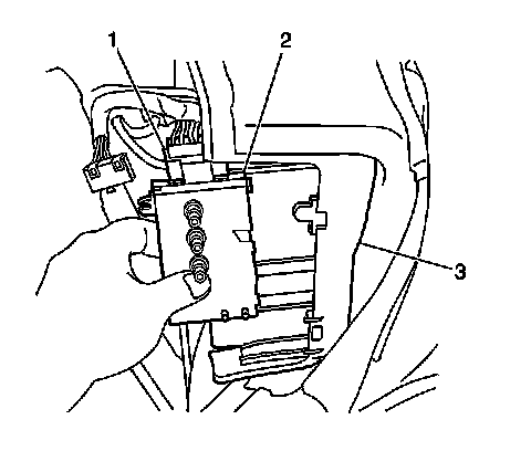 4. On the underside of the seat cushion, locate the retainers (1) securing the power seat switch bezel to the seat cushion frame (3).