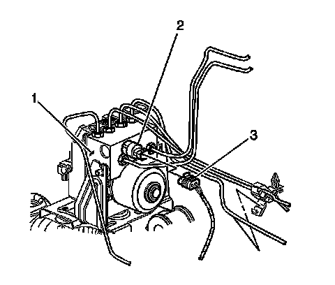 3. Remove the brake fluid pressure sensor (2) from the electronic brake control module (EBCM) (1).