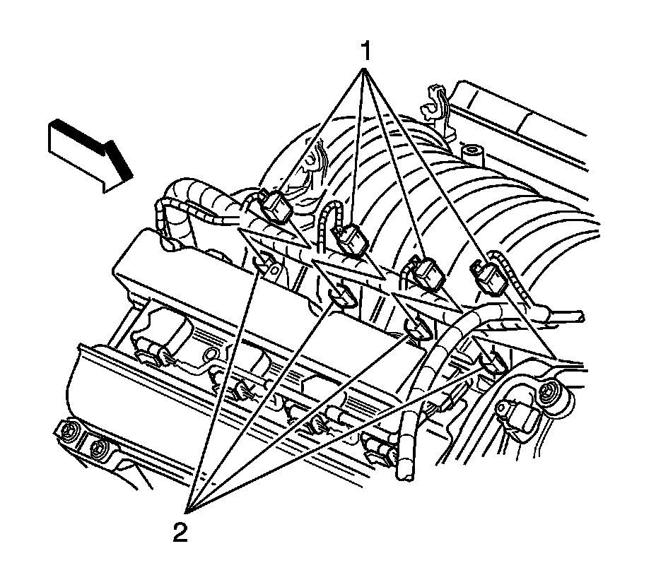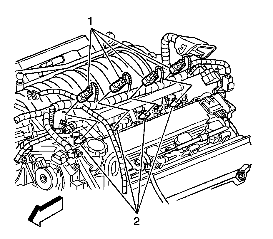 8. Disconnect the right side fuel injector electrical connectors (1) from the fuel injectors (2).