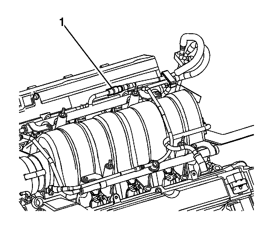 12. Disconnect the fuel line from the fuel rail (1). Refer to Metal Collar Quick Connect Fitting Service (Metal Collar Quick Connect Fitting Service) or Plastic Collar Quick Connect Fitting Service (Plastic Collar Quick Connect Fitting Service).