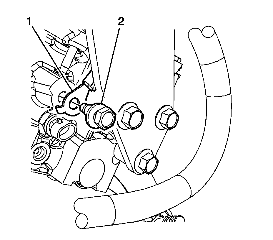 7. Remove the bolt (2) securing the negative battery cable (1) to the engine block.