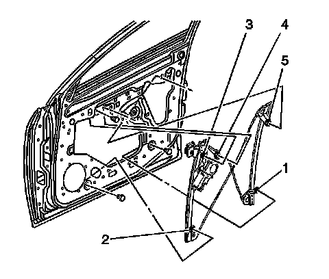 2. Install the window regulator bolts (1, 2, 3, 4, 5).