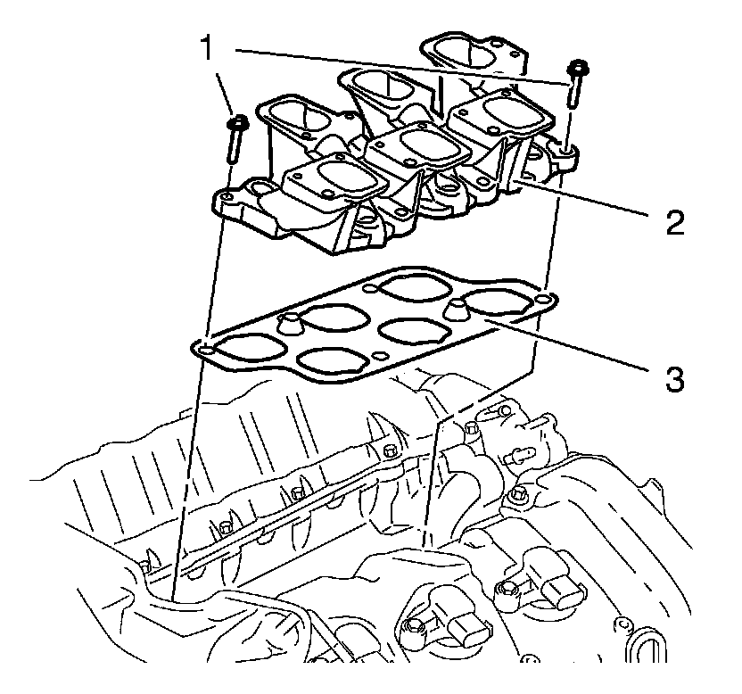 3. Install the 2 lower intake manifold bolts (1) and tighten to 23 Nm (17 lb ft).