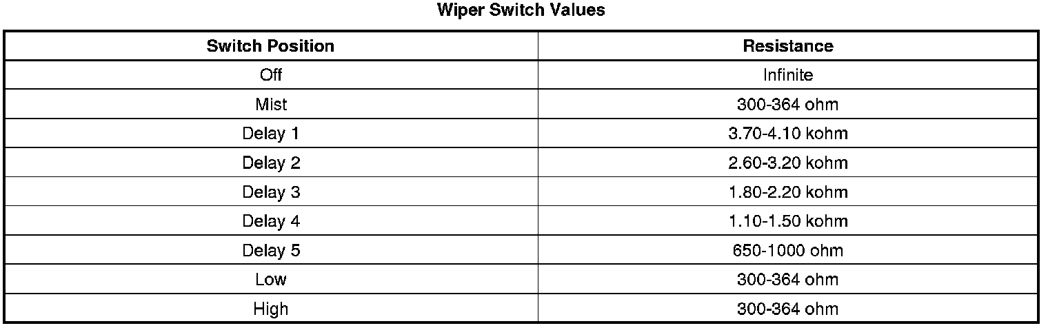 3. While cycling the S82 windshield wiper/washer switch through each delay and speed position, test for the specified resistance between the low reference terminal 2 and the signal terminal 3.