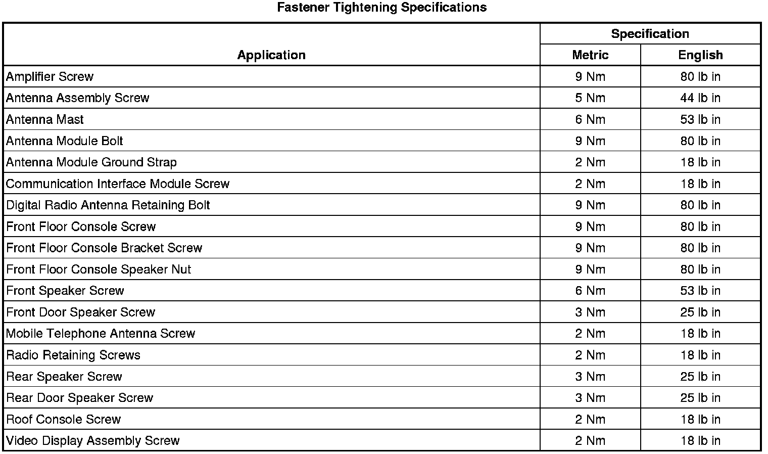 Fastener Tightening Specifications