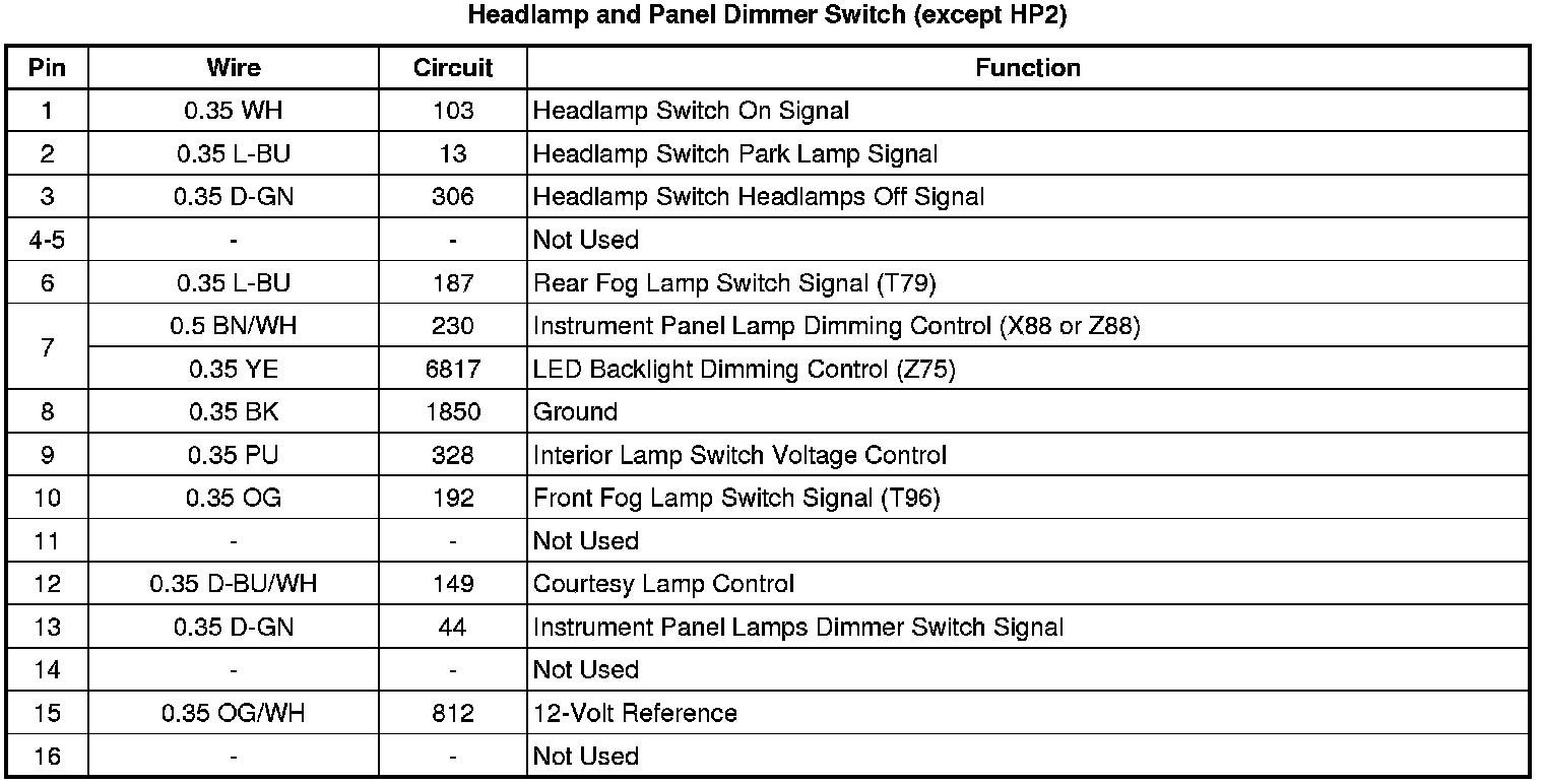 Headlamp and Panel Dimmer Switch (except HP2)