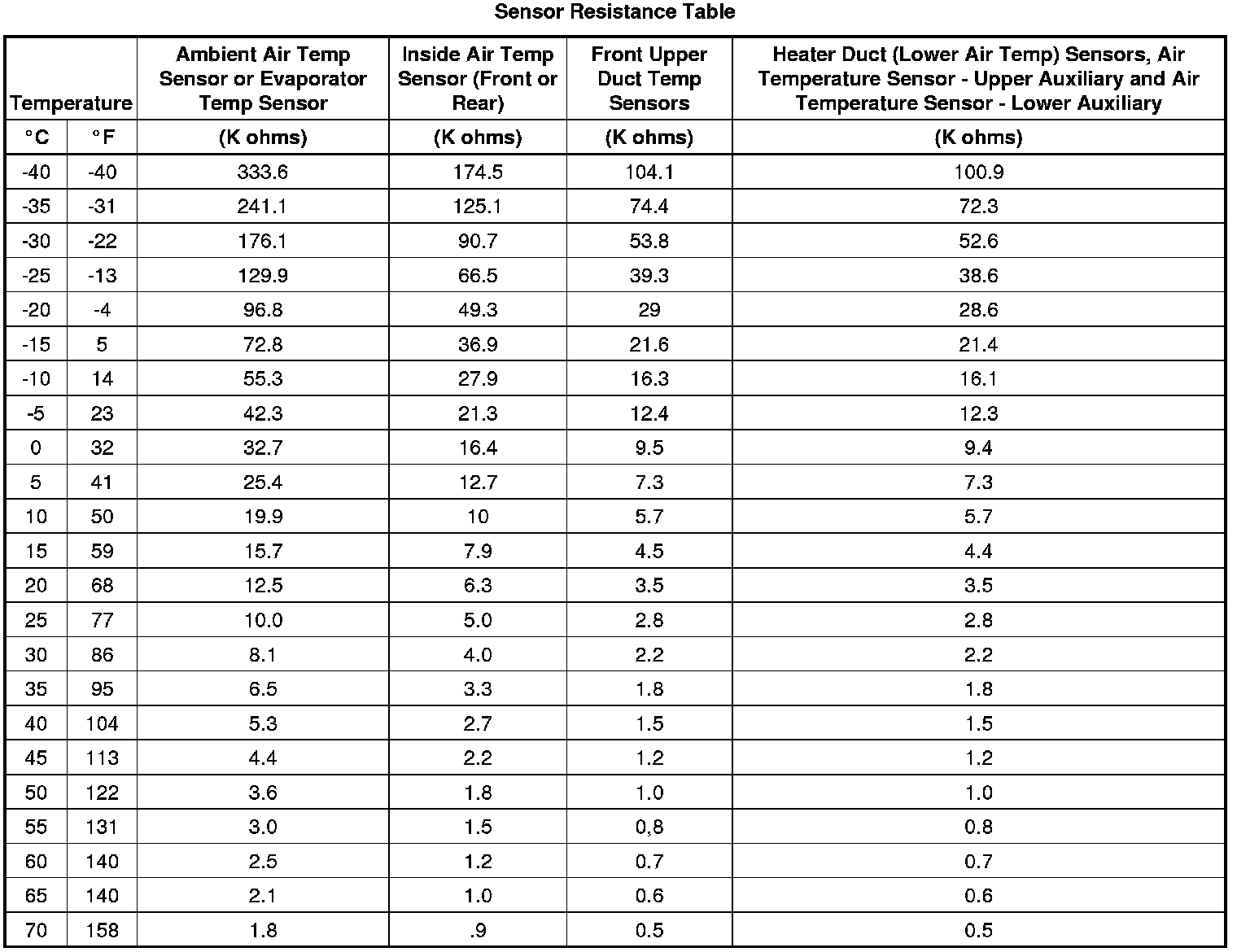 Sensor Resistance Table