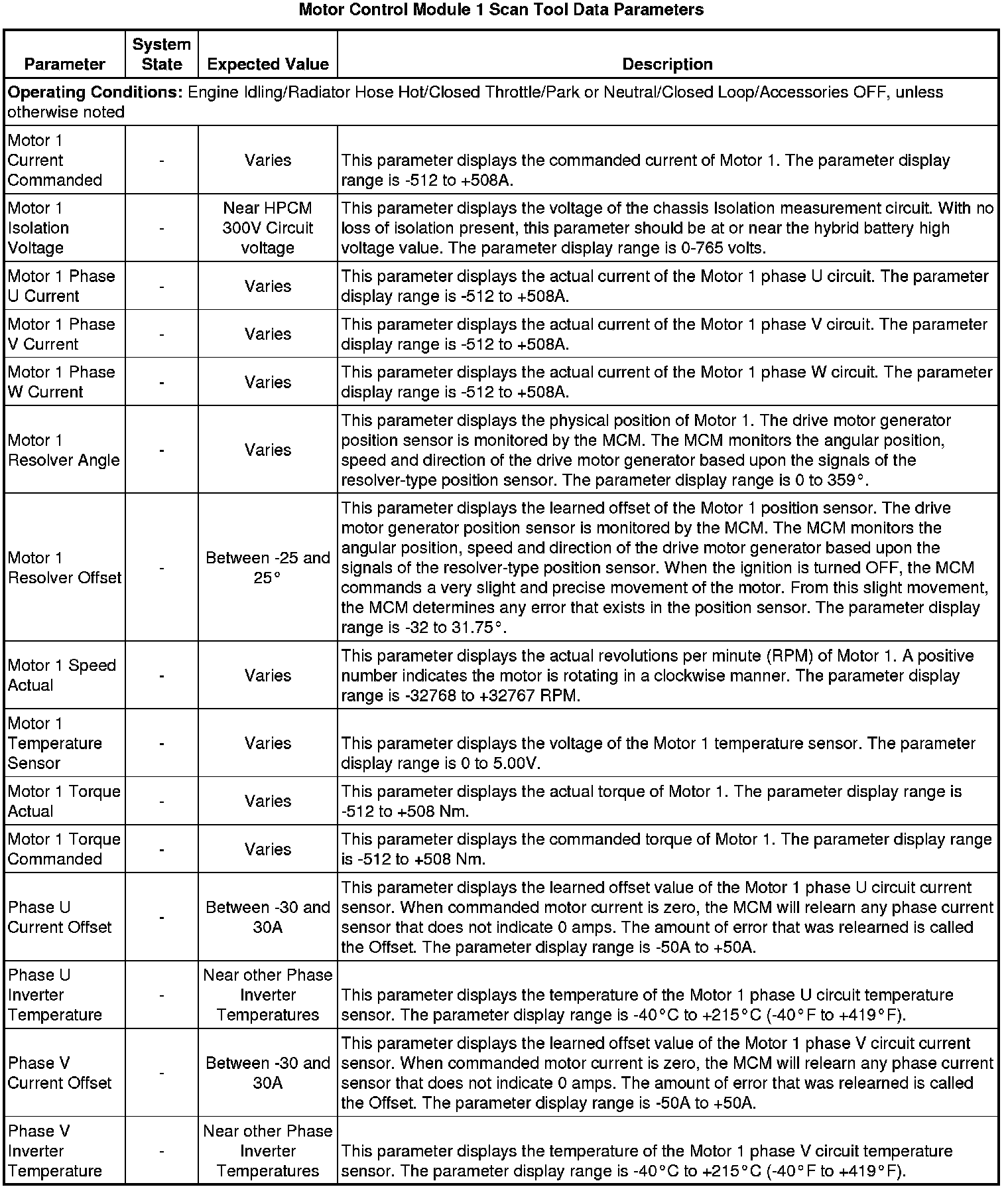 The scan tool values from a properly running vehicle may be used for comparison with the vehicle you are diagnosing. The Motor Control Module 1 Scan Tool Data Parameters list represents values that would be seen on a normally running vehicle.