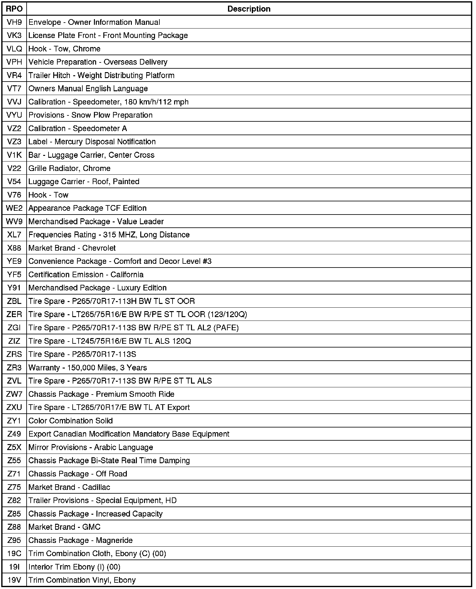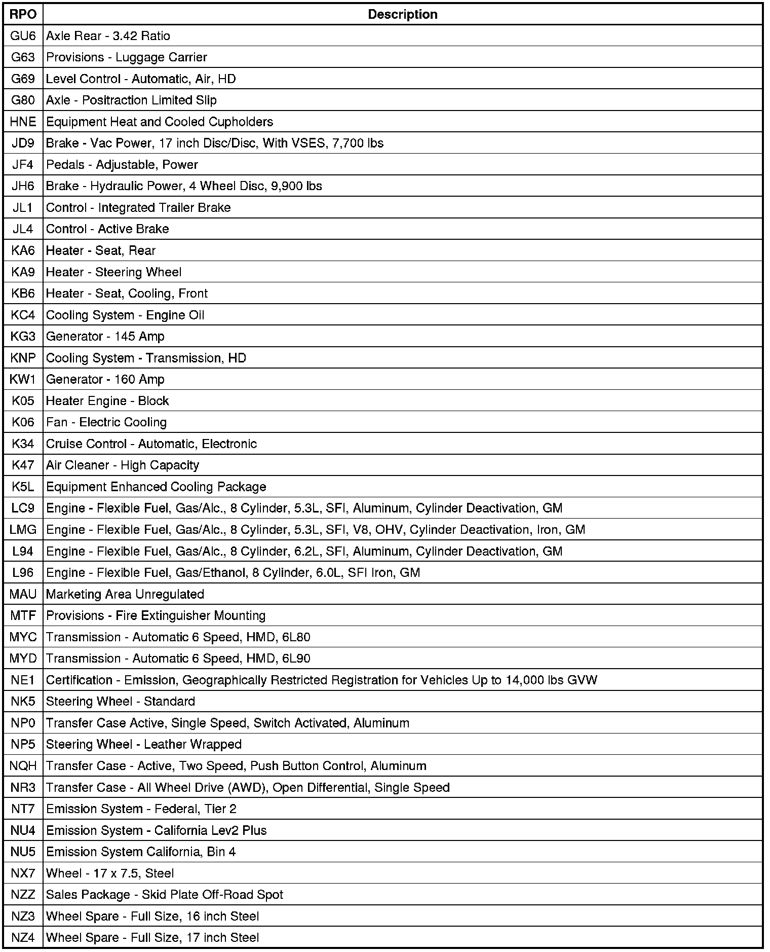 RPO Code List (Escalade ESV, Suburban, and Yukon XL)