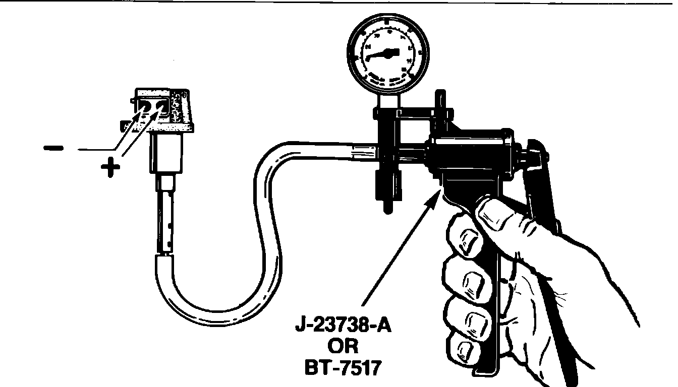 ^ Use J-23738-A or BT-7517, hand operated vacuum pump, to apply approximately 5" Hg (16 kPa) vacuum to the seal end of the solenoid. Do not exceed 5" Hg (16 kPa) vacuum as the fuel valve tip could become stuck in the metering orifice.