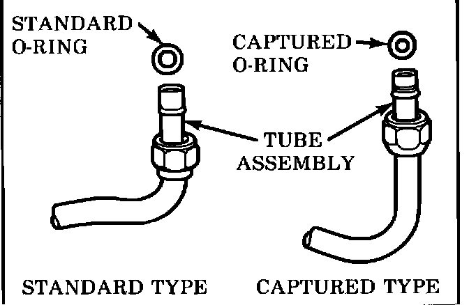 D. Install new G.M. approved service replacement air conditioning O-rings at all disassembled fittings, except where provided on new componenets. The connection fitting design should be carefully identified to ensure installation of the correct air conditioning service replacement O-ring, see Figure 6. Some connections will implement a "captured" O-ring design fitting that uses a groove to retain the O-ring, while others do not have a groove and use a "non-captured" or "standard" O-ring. Before installation, verify that both O-rings and fittings have not been nicked or deformed. Always slip the O-ring onto the flange tube to ensure proper locating and sealing. Failure to use the proper service replacement parts and procedures may result in excessive Refrigerant 12 leakage.
