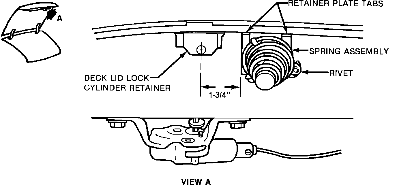 4. Locate retainer plate to flat surface of deck lid inner panel 44 mm (1-3/4") to right of center of lock cylinder retainer (Figure 1). Tabs on retainer plate must fit tightly to curvature of lid inner panel.
