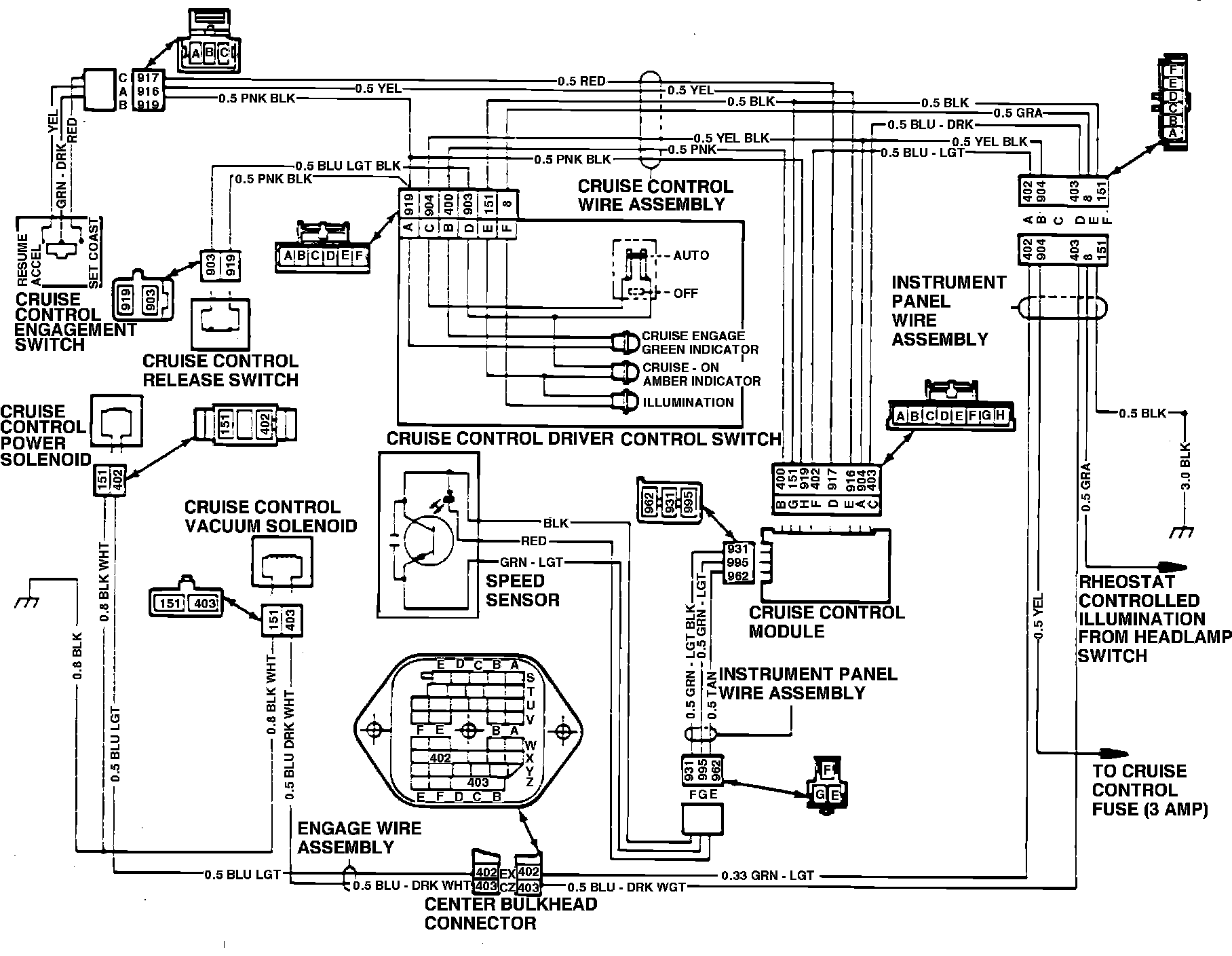 3. Probe the three terminals of the cruise harness connector, first with the instrument panel switch in ``Off'' position, then in the ``On-Auto'' position. In ``Off'' position, there should be no power to any of the terminals. In the ``On-Auto'' position, pink-black wire, test lamp should indicate current, and the yellow and red wire of the terminal should not indicate current. Also, in the ``On-Auto'' position the amber indicator should light on the instrument panel.
