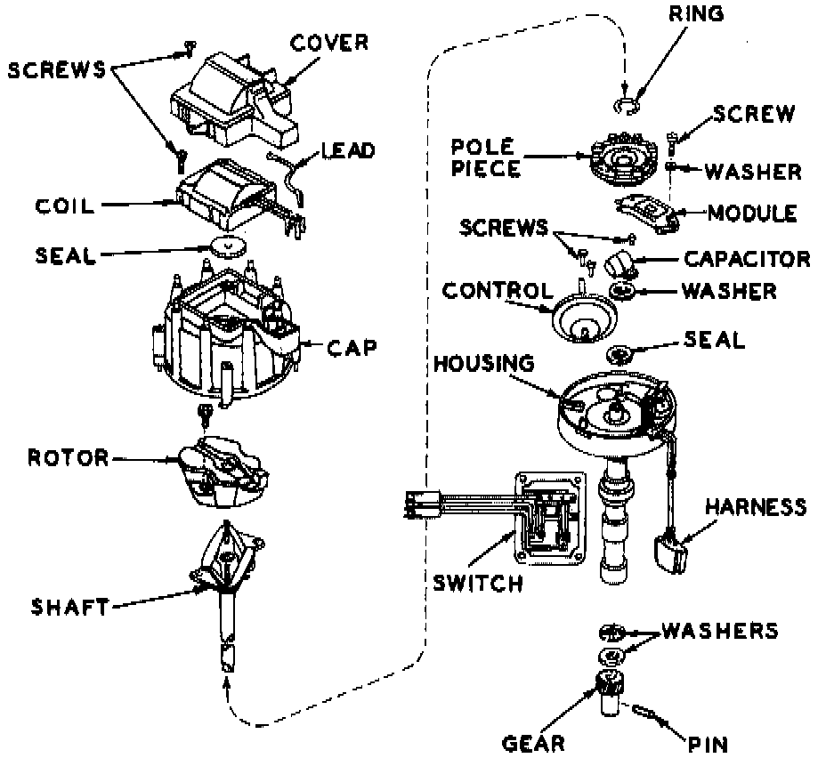 13. Remove capacitor and wiring harness from distributor housing.