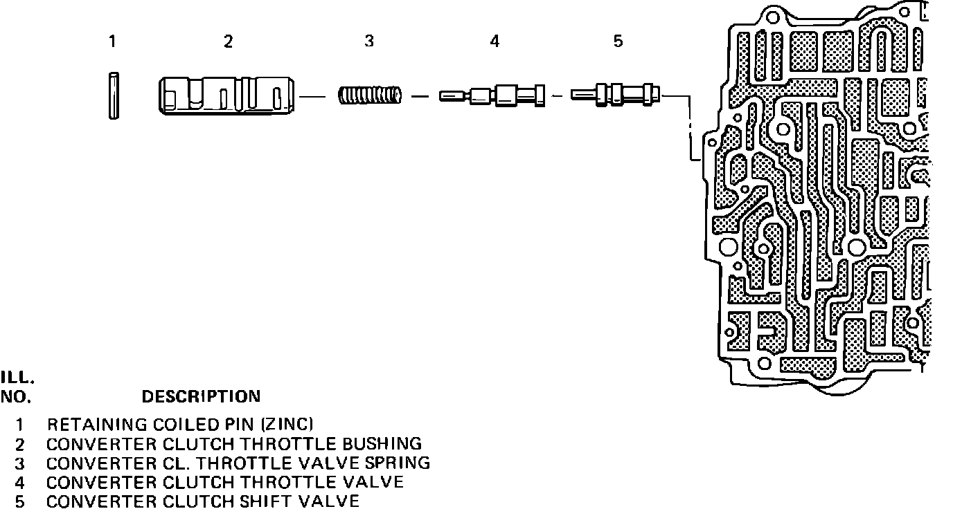 Early production 1982 Cadillacs equipped with gasoline engines and THM 200-4R or 325-4L transmissions were built with a Torque Converter Clutch (TCC) valve train installed in the control valve assembly of the transmission (refer to Figure 1). This original design control valve assembly contains a hollow bushing as well as converter clutch throttle and shift valves and a calibration spring.