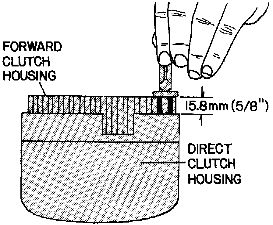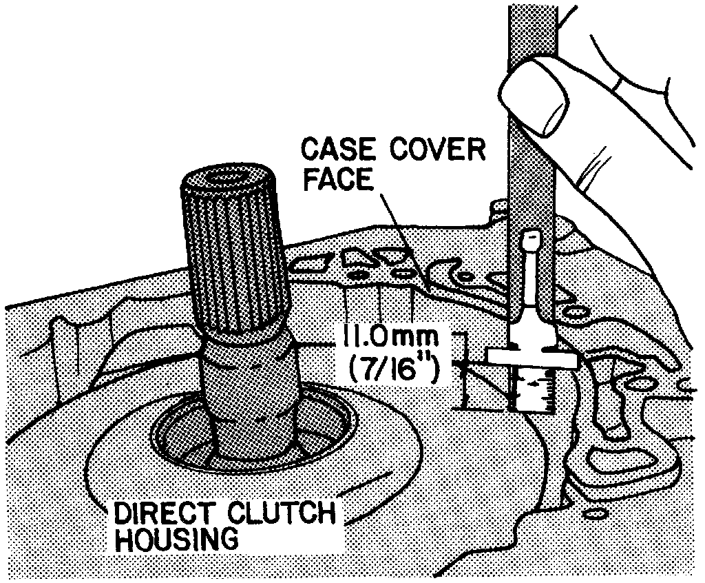 4. Install direct and forward clutch assemblies. When correctly seated, the direct clutch housing will be about 7/16 inch from case cover face, see image.