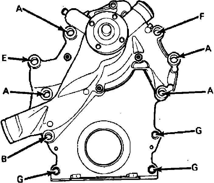 14. Reverse procedure to install. Coat oil pan front lip with suitable sealer. Refer to Fig. 9 and torque bolts ``A,'' ``E'' and ``F'' to 30 ft. lbs. and bolts ``B'' and ``G'' to 15 ft. lbs.