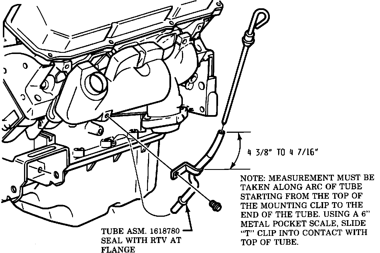 Before installing a new dipstick, the dipstick tube length should be measured as indicated in Figure 2. If this dimension is between 4 3/8", and 4 7/16" the tube is correct and the dipstick should be replaced. If the tube dimension is not between these dimensions, replace both the tube and the dipstick according to the procedure in the Service Information Manual.