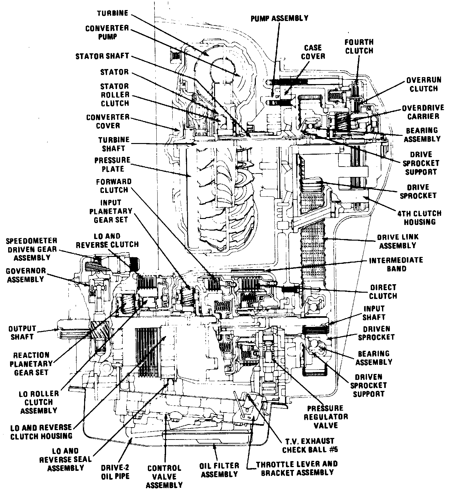 The Turbo Hydra-Matic 325-4L transmission, see image, is a fully automatic front wheel drive unit consisting of a four element torque converter with converter clutch, three compound planetary gear sets and an overdrive unit. Five multiple disc clutches, two roller clutches and a band provide the friction elements required to obtain the desired function of the compound planetary gear sets and the overdrive unit. The combination of the compound planetary gear sets and the overdrive unit provides four forward ratios and one reverse. Changing of the gear ratios is fully automatic in relation to vehicle speed and engine torque.