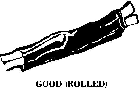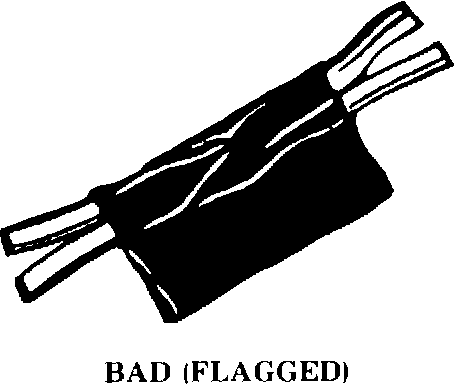 Center and roll the splicing tape. The tape should cover the entire splice. Roll on enough tape to duplicate the thickness of the insulation on the existing wires (see Figure 5). Do not flag the tape. Flagged tape may not provide enough insulation, and the nagged ends will tangle with the other wires in the harness (see Figure 6).