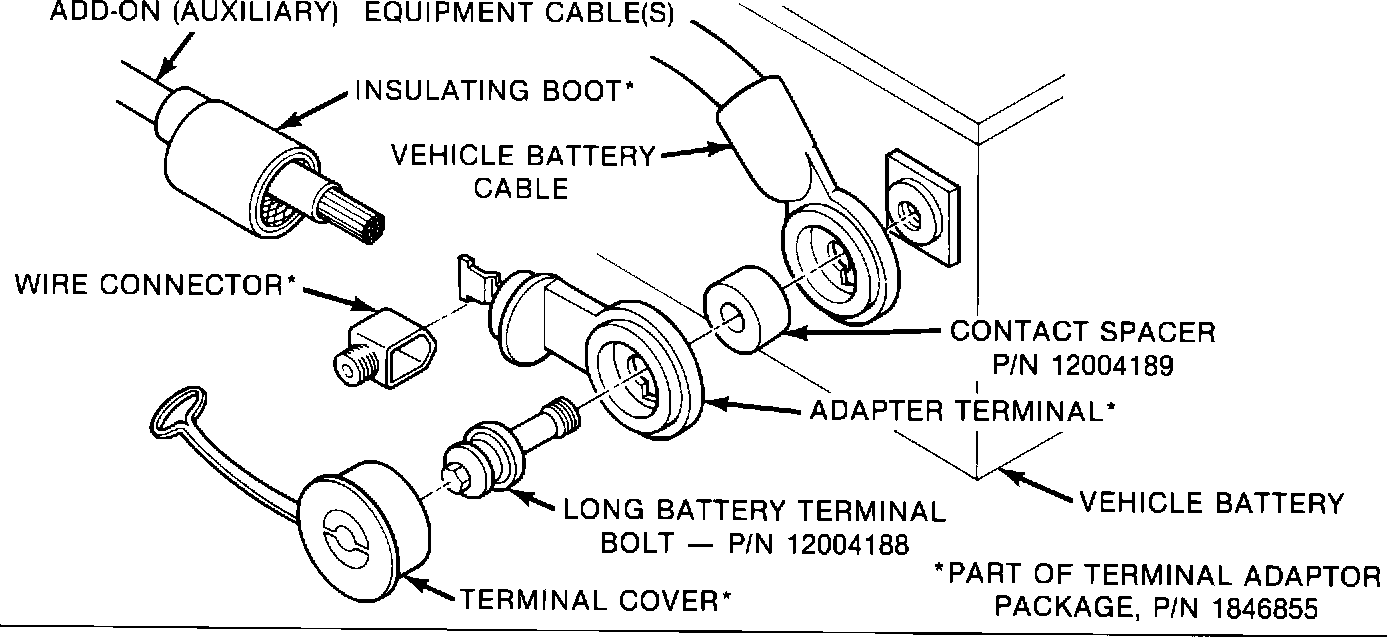 The Side Terminal Adaptor Package, P/N 1846855, when combined with the longer battery bolt (PIN 12004188) and spacer (P/N 12004189) will provide the corrosion resistant connection.