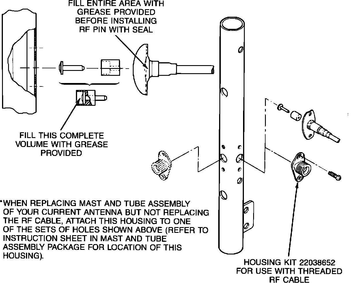 When replacing a power antenna mast and support tube using the original threaded lead-in (RF cable), it will be necessary to use RF housing kit, P/N 22038652, in place of the original RF housing and screw. This is necessary to obtain a proper RF connection when the lead-in is installed. The RF pin supplied with the mast and support tube will be too short when used with the original threaded RF housing. Be sure that screws do not contact the mast inside the support tube when fully seated as this could short circuit the antenna. A check with an ohmmeter from mast to the support tube should show infinite resistance or open circuit. A check from the lead-in center conductor for continuity to the mast should be "O" ohms. Using the new RF housing in kit, P/N 22038652, will ensure a good contact. Be sure to use a liberal amount of the grease, supplied in the kit, to prevent water entry. Refer to figure below.