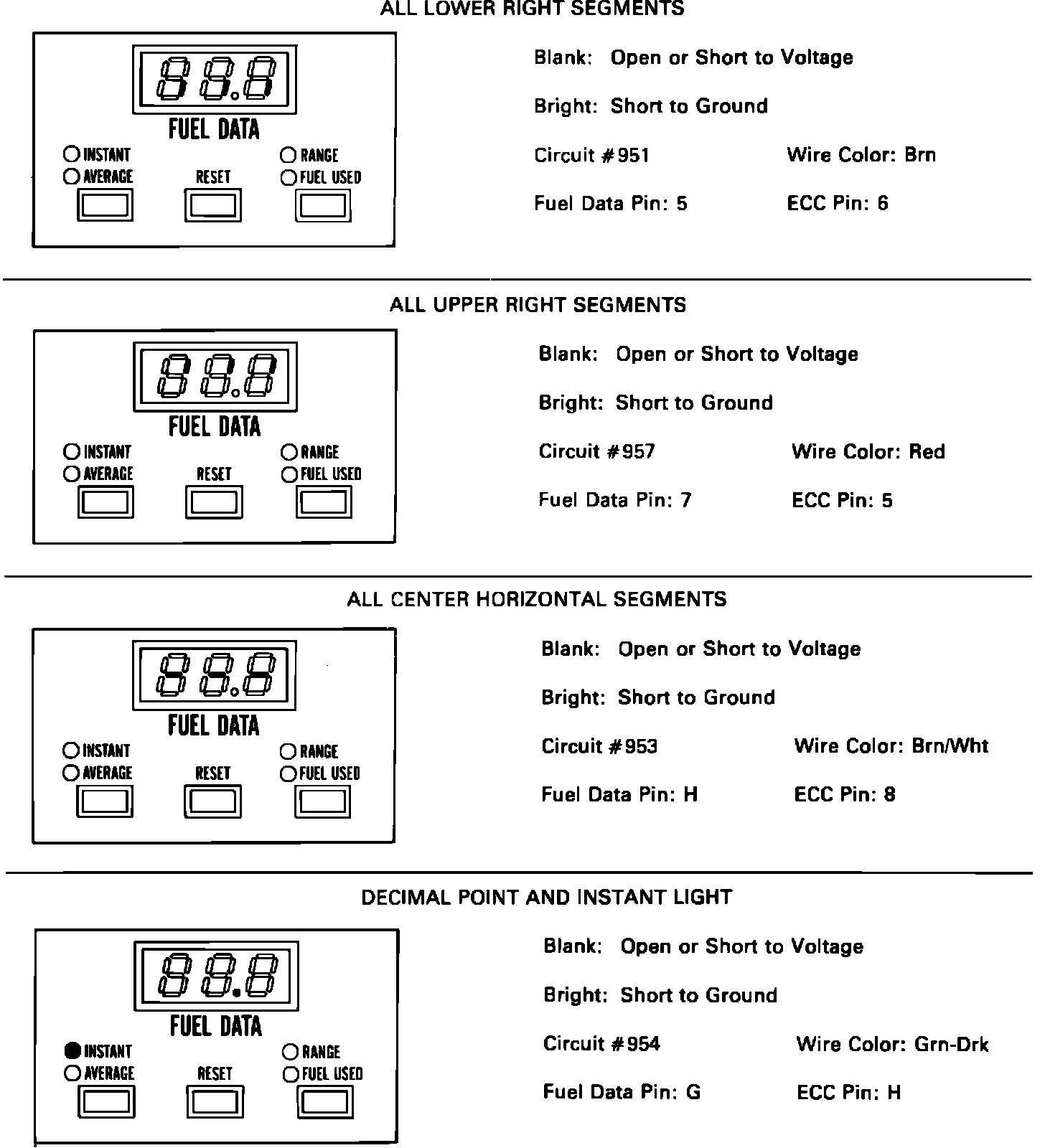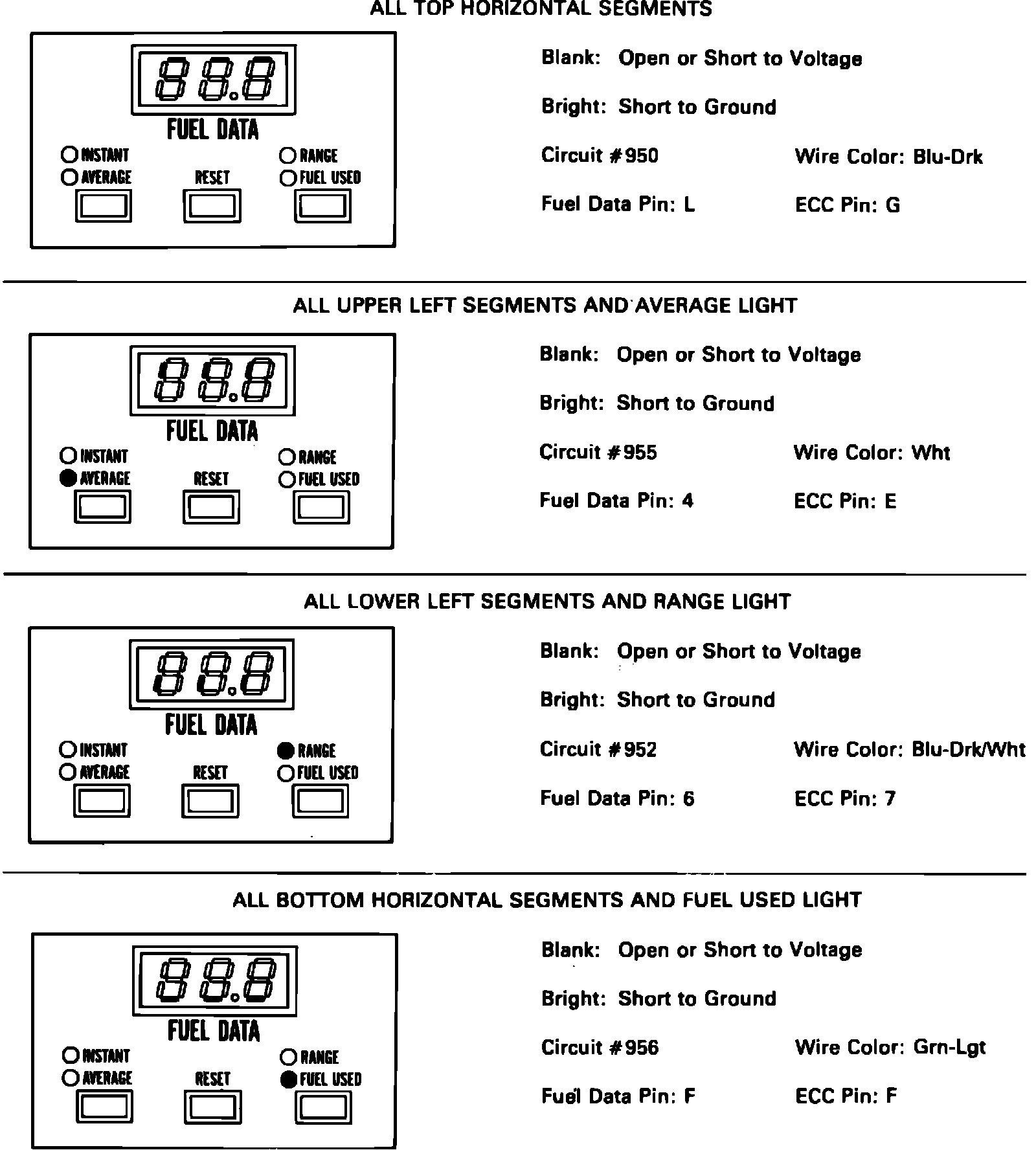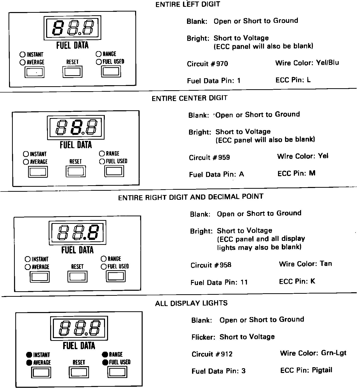 4. Depress ``fuel used/range'' button (``fuel used'' button on models with digital cluster) while ``instant MPG'' is displayed. If ``fuel used'' indicator lights, proceed to step 5 or 6. If lamp does not light, replace fuel data panel.