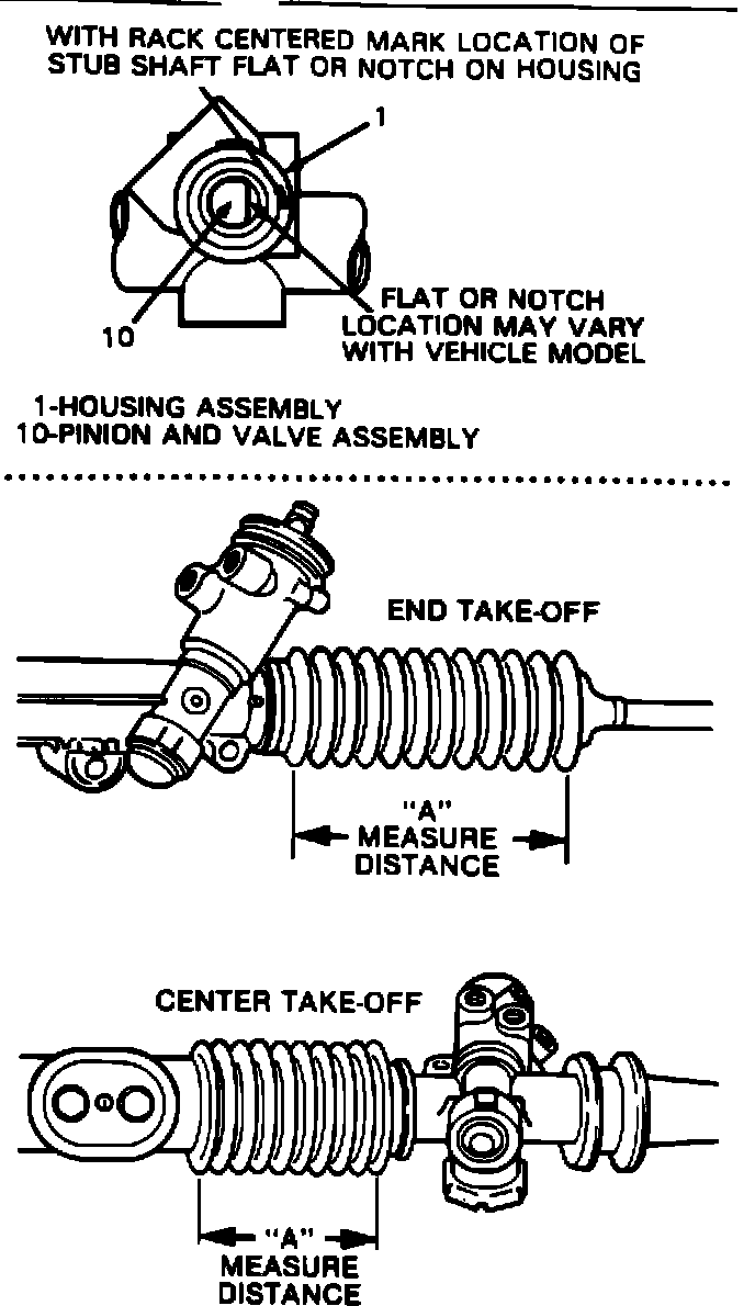 When pinion and valve assembly is fully seated, flat or notch in stub shaft and first mark on housing must fine up while the rack is centered in the housing. Refer to measurement "A" to verify proper rack position. (See Figure 3.)