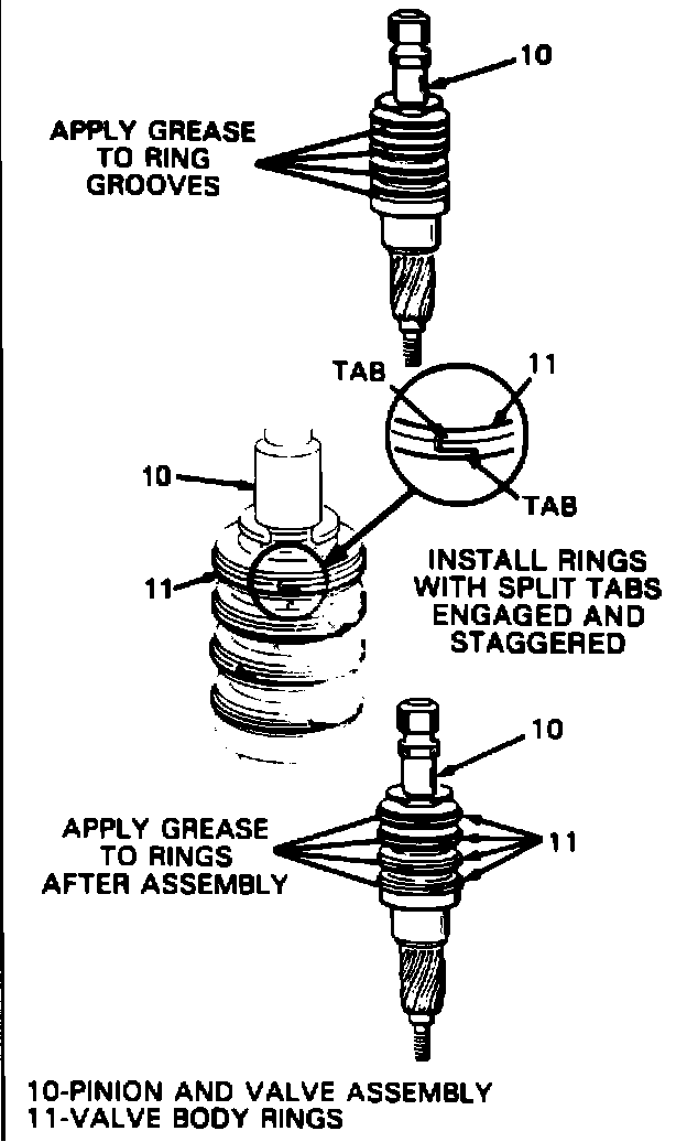 1. Install new valve body rings to pinion and valve assembly. (Care must be taken not to cut rings at installation.)