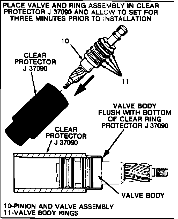 2. Place pinion and valve assembly into clear pinion and valve assembly ring protector J 37090. (Be sure to use only the dear protector.) Allow to set for approximately three minutes while continuing installation preparation. This allows the valve rings to be properly sized.