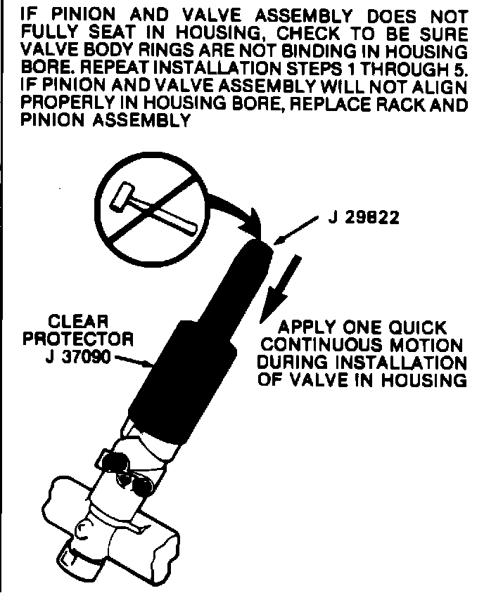 Set pinion and valve assembly onto housing using J 37090. Use J 29822 pinion seal installer to push assembly into housing bore. DO NOT hammer or use excessive force. If pinion and valve assembly does not fully seat in housing, check to be sure valve body rings are not binding in housing bore. Check rings for cuts or damage. Repeat installation steps 1 through 5. If pinion and valve assembly will not align properly in housing bore, replace rack and pinion assembly.