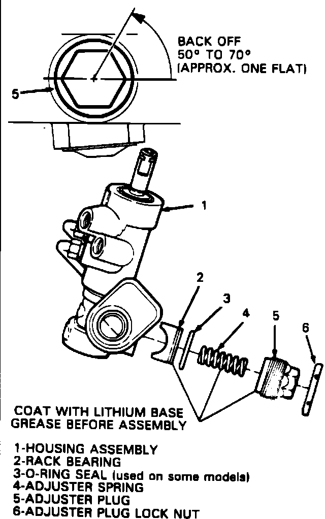 With rack centered in the housing, turn adjuster plug clockwise until it bottoms in the housing, then back off 50~ to 70~ (approx. one flat). Check torque on pinion. Maximum pinion preload torque is 1.8 N-m (16 Lbs.In.).