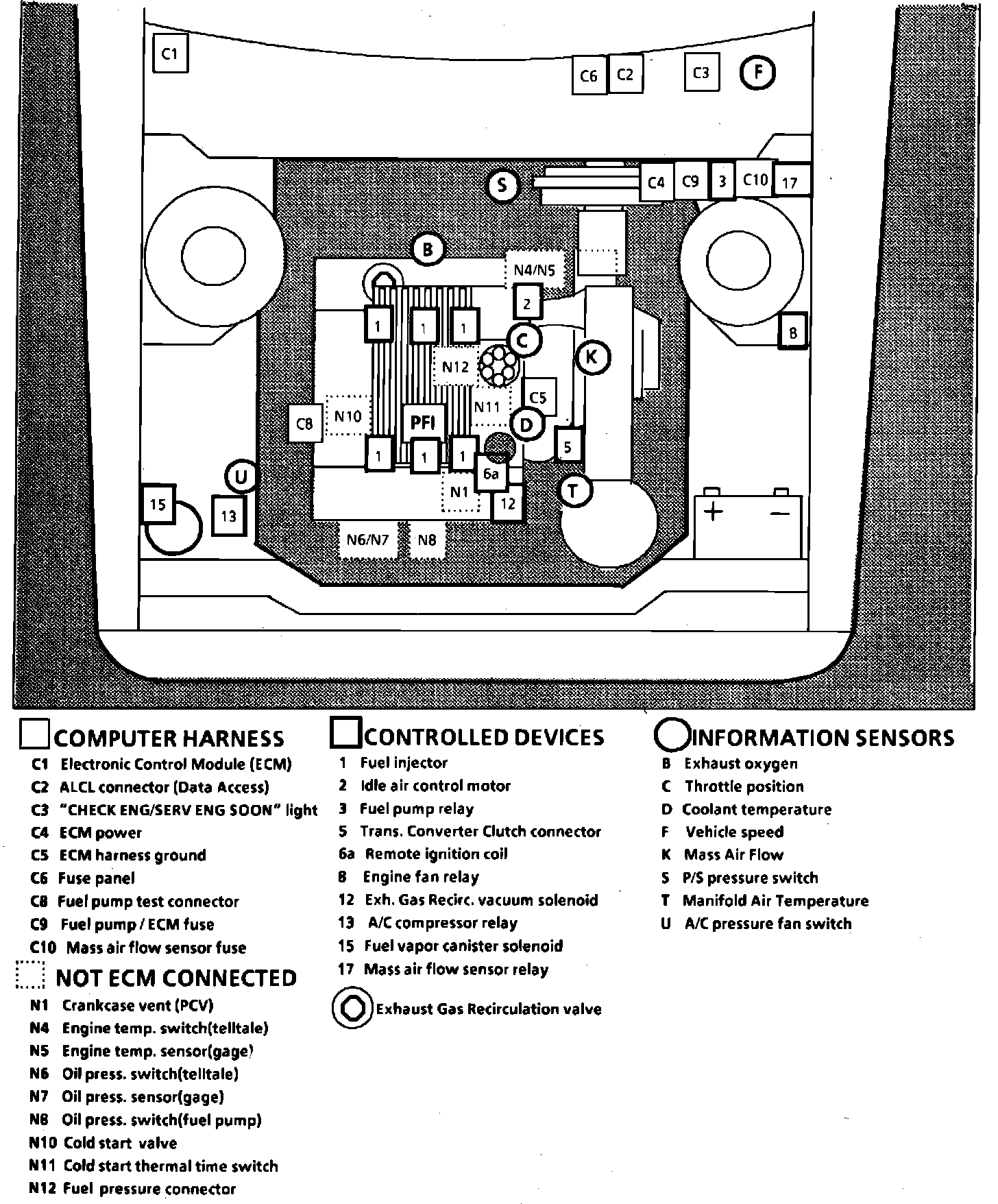 Fig. 19 Emission Component Location. 1985 Cimarron W/V6-173/2.8L, PFI: