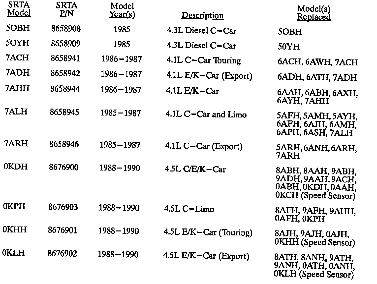 SRTA Model Replacement Chart (4T60)