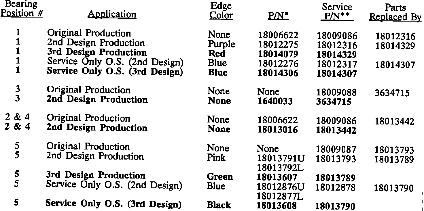 The chart below amends and updates the main bearing usage chart in Bulletin T-87-15. This summary of main bearing applications is intended to clarify current bearing availability and to identify which bearings are in use on an engine being worked on. This information is not intended to supersede the GMSPO parts books and future parts catalog revisions. Superseded part numbers will be handled through GMSPO only, no further revisions to this bulletin are planned.