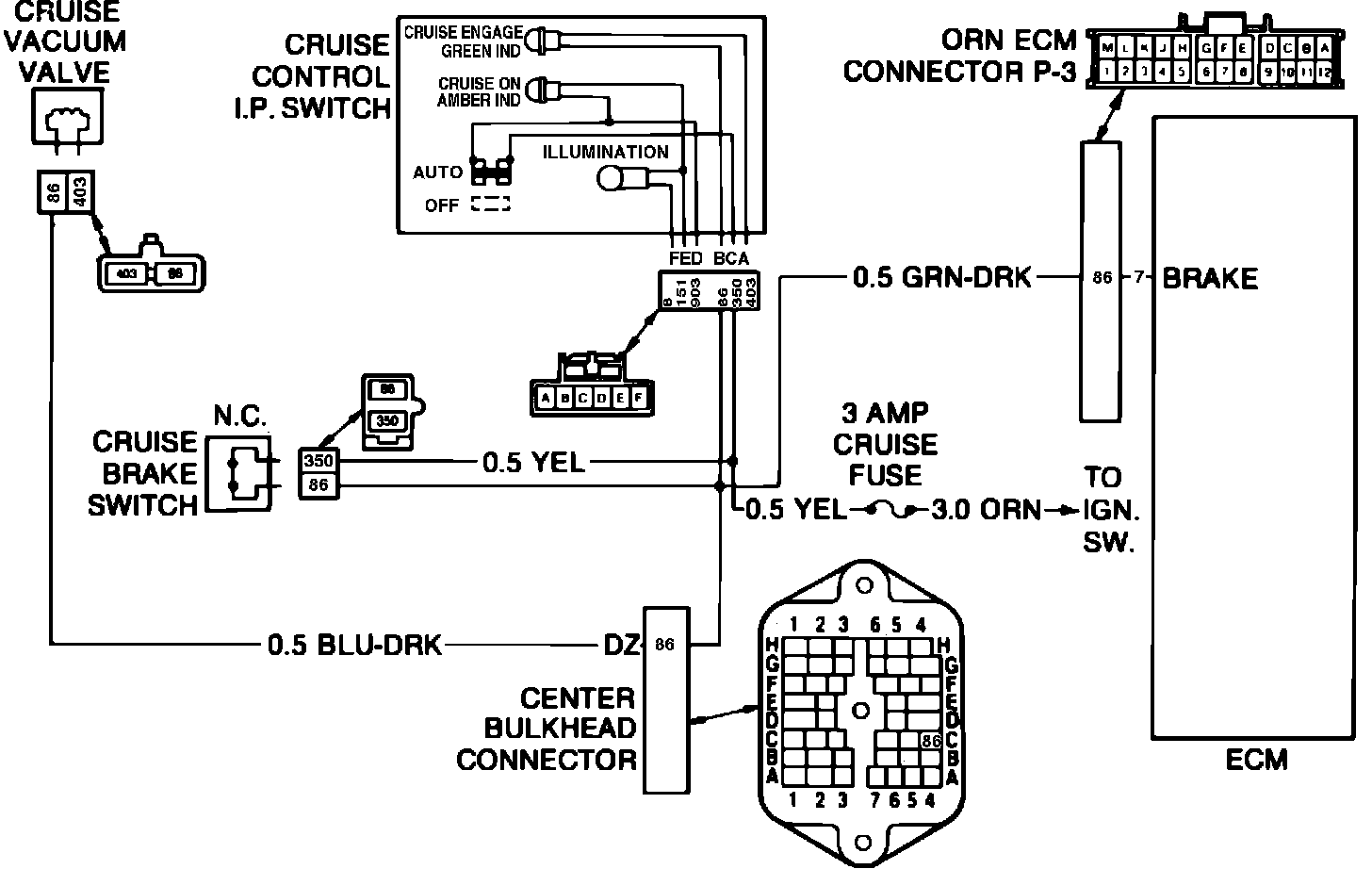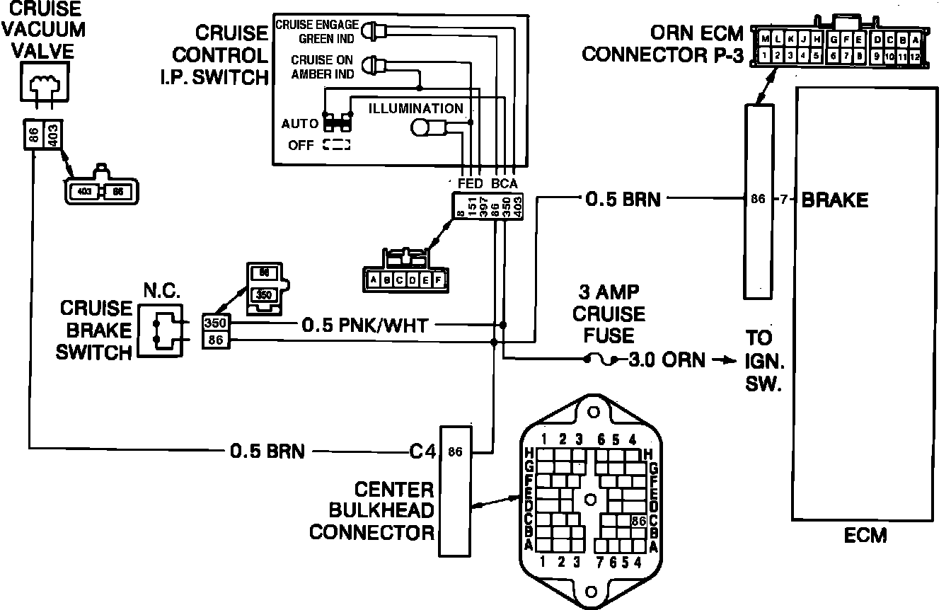 6. Check three amp cruise control circuit fuse. If fuse is satisfactory, check circuit 904 (1985, 350) for open and repair as necessary.