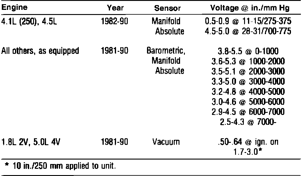Manifold Absolute Pressure Sensors: Measure voltage with ignition on and engine off. Start engine and apply 10 in./250 mm Hg to unit, voltage should be 1.2-2.3 volts less.