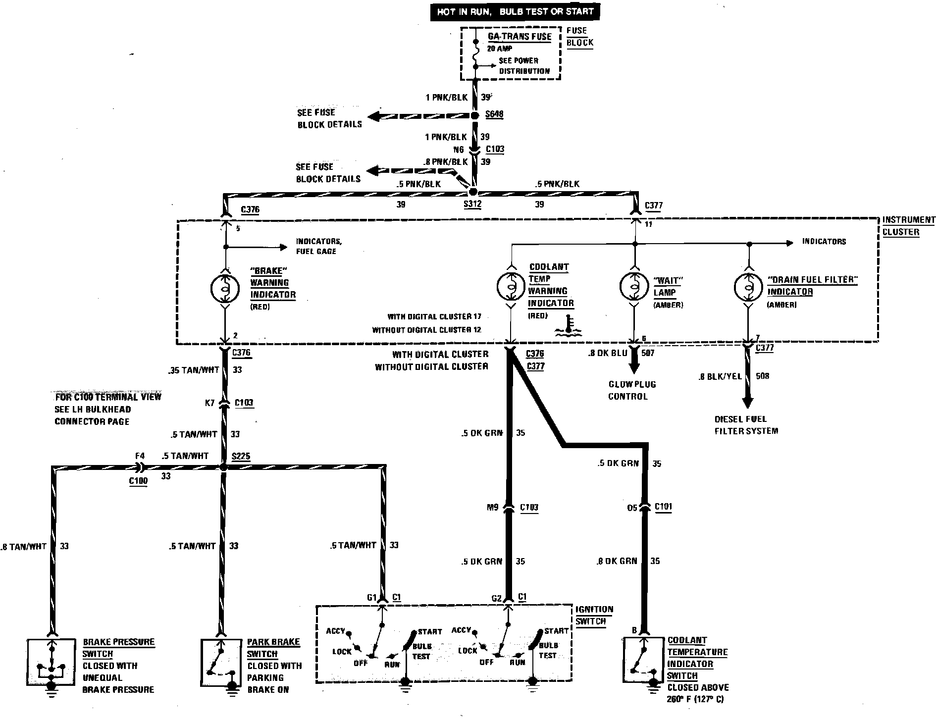 Brake Warning System, Coolant Temperature, Drain Fuel Filter & Wait Lamp Indicator Wiring Circuit: