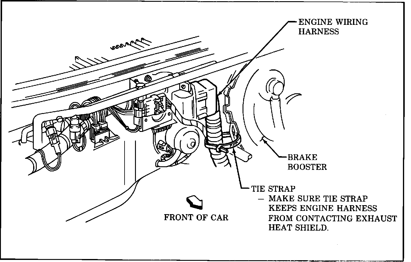 To prevent accidental grounding, all cars should have the engine harness secured to the brake booster with a tie strap as shown in Figure 1. In some cases this strap may be missing and others may have a tie strap of insufficient strength that may break and allow the harness to contact the heat shield. After vehicle identification number 603069 for Eldorado and 802221 for Seville a new heat shield and a stronger tie strap are used in production to prevent harness damage.