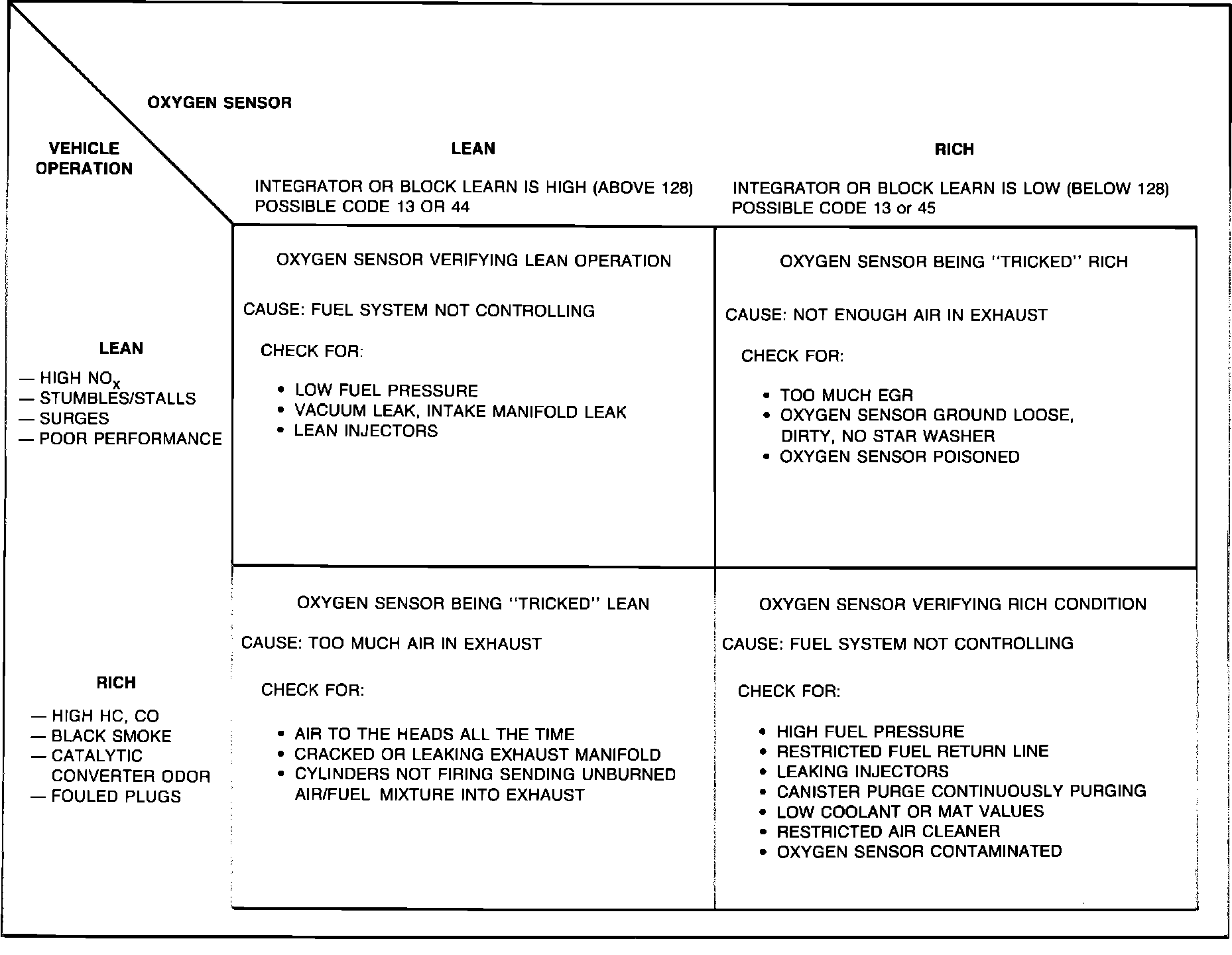 There are four fuel control operating conditions that can be diagnosed using oxygen sensor and engine emissions information. In each case, the information available about the oxygen sensor (cross counts, integrator, and block learn) will help pinpoint the cause of poor vehicle performance.
